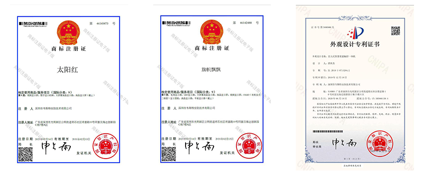 太陽(yáng)紅商標(biāo)、外觀專利證書(shū)、軟件著作權(quán)證書(shū)