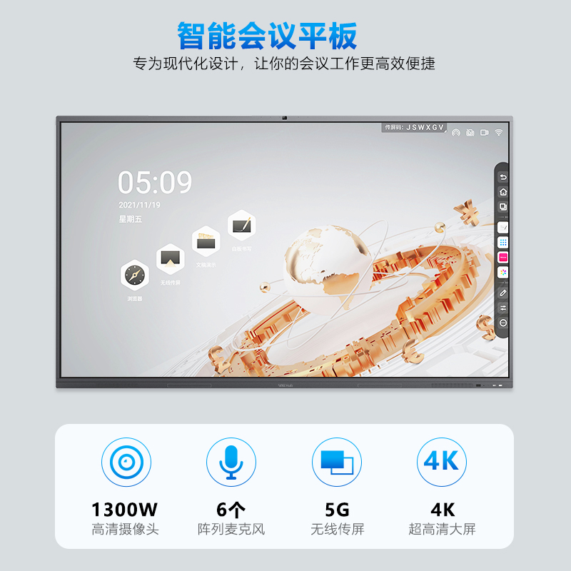集高清視頻收集、手寫屏幕、電腦、電視、音響等功用于一體,無需裝置程序。免除繁亂的接線,裝備可移動支架,使會議準備愈加輕松,令會議進程愈加暢通。