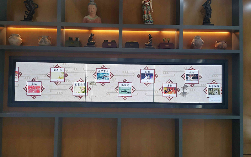 文化長廊展示系統由橫向的屏幕拼接而成,利用先進的拼接工藝,加上觸摸互動功能,打造一條極具視覺沖擊力的文化長廊。整條文化長廊可由 3 塊、6 塊或者 8 塊超窄拼縫的液晶屏幕拼接而成。除此之外,系統精選優質數字資源(圖片、視頻等),由右至左緩緩流動,宛如歷史長河源遠流長,歷史的經典與現在科技的交融迸發出更閃亮的火花,通過人、媒、數據的互動,孕育不一樣的知識和服務。