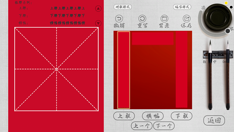 1、功能默認首先書寫上聯的內容,左邊的上聯會有一個黃色的框體閃爍,可以在左邊區域的白色田字格中書寫上聯的具體內容,寫完一個字后通過點擊下一個按鈕 繼續在左邊的田字格中書寫楹聯的內容,通過點擊上一聯和下一聯以及橫幅 按鈕切換決定 使用者書寫內容是上聯內內容還是下聯或者橫幅內容。