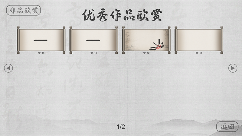 歷史作品按鈕:點擊歷史作品按鈕 可以對以往保存過的作品進行瀏覽觀看,可以通過點擊作品下方的心型按鈕則可以對作品進行點贊,點贊越高的作品排名會越靠前。