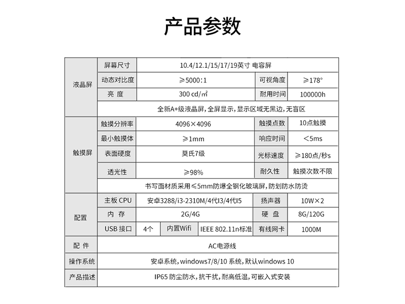 產品概述: 工控一體機又名工業控制計算機,是專門為工業控制設計的計算機,憑借著其輕薄精巧的外觀,簡單的操作,強大的功能,在行業中占據著不可或缺的位置。全鋁結構,被動散熱,無風扇設計,支持安裝X86/安桌/顯示器主板,前面板支持IP65等級防護,安裝結構兼容桌面式、壁掛式、嵌入式。 產品特點: 多種高清分辨率可選,擁有100%sRGB色域,還原真實色彩; IPS高清屏,178°超廣視角,每一個角度都可以完美呈現; 有效過濾380-445nm波段的藍光,長時間觀看不累眼,守護眼睛; 使用高強度工業級邊框,穩固結實,放撞放刮,惡劣環境可使用; IP65級防塵防水,耐高低溫,-10°C~70°C皆可正常運行,擁有超強抗干擾能力; 工業級應用,全年24小時持續運行,使用穩定且耗能低; 十指觸控,手指點擊屏幕快速響應,多種快捷手勢等你探索; 外嵌式安裝,靈活應用于多種場景,增加了使用的便捷性;