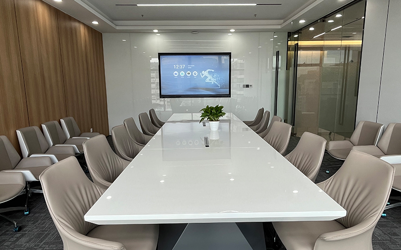 對于大部分工作者而言,每天或多或少都會參加一些會議,因此會議室對大家來說并不陌生。對于傳統的會議室,我們常常會看到設備不僅眾多,布線也很繁瑣、調試起來也很耗費時間,從而浪費了工作的有效時間。當然時代在進步,現在的會議室已經越來越一體化、簡約化了,比如下圖所展示的會議室,便是典型的現代性會議室。可能看上去好像沒有什么不一樣,只是多了一臺“電視機”。但是當你回顧一下你的手機,你就會明白,這臺“電視機”的顯示功能,只是它的基本能力之一,準確來說:這是一臺智能會議一體機,也叫智能會議平板。