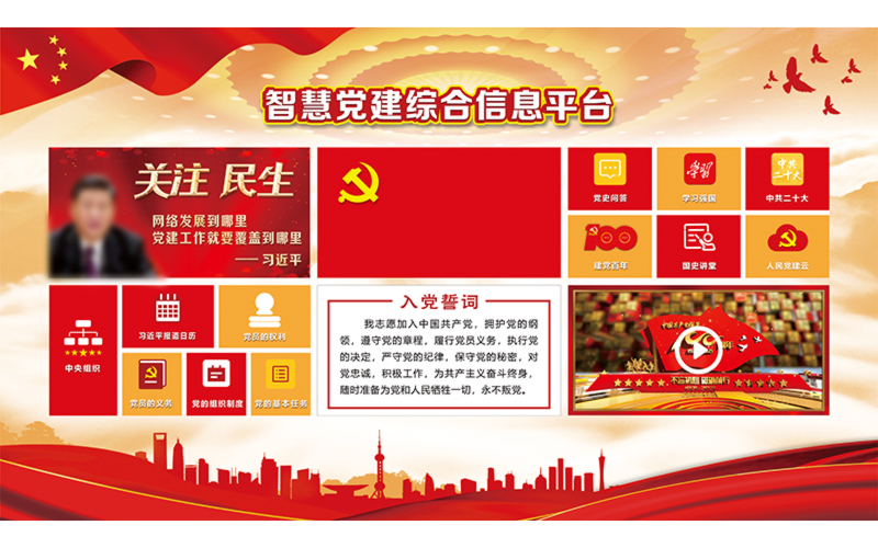 智慧黨建平臺系統(tǒng)基于智慧黨建一體機(jī)設(shè)備,結(jié)合互聯(lián)網(wǎng),可實現(xiàn)信息同步更新,網(wǎng)上信息實時更新,支持圖片背景隨機(jī)更換或自定義更換,支持多種格式視頻播放,功能鍵可以自定義設(shè)置,也可以根據(jù)自己的喜好自由拖動其功能鍵的位置。支持多種格式文檔的內(nèi)容展示,子頁面設(shè)置無限制,方便不同人群滿足不同的需求,人性化的設(shè)計和功能,非常方便人們學(xué)習(xí)和瀏覽,減少人們不必要花費的時間,提高工作效率,同時也能更好地促進(jìn)黨建文化的傳播和學(xué)習(xí)。