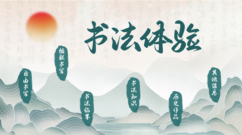 動態(tài)古典導(dǎo)航界面,包含自由書寫、楹聯(lián)書寫、書寫臨摹、書法知識、歷史作品、其他信息六大功能模塊。