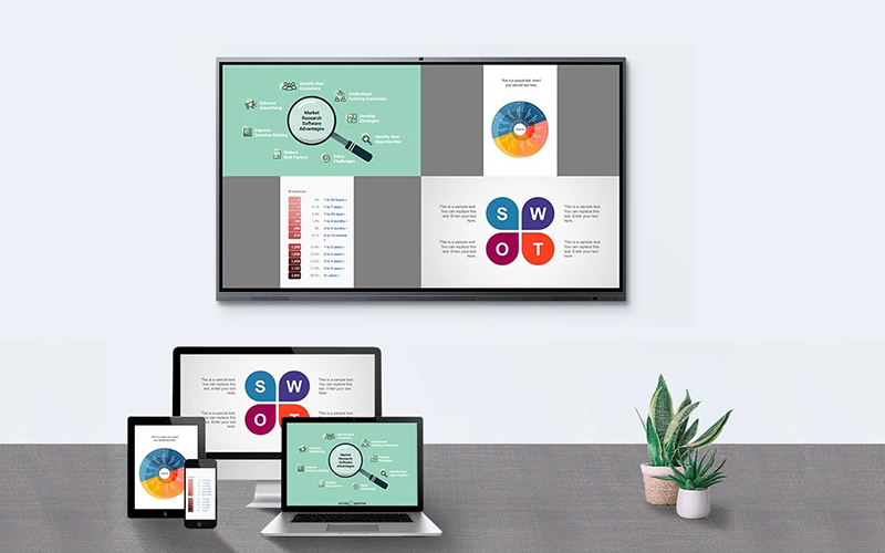 智能會議平板是一種集投影儀、電子白板、電視、廣告展示、音響、麥克風等于一體的多功能智能化會議設備。配備了智能會議平板的會議室,無需再另外購置以上設備,免于線材的束縛,更無需專人對設備進行維護和連接,可以有效節約成本,提高會議效率。