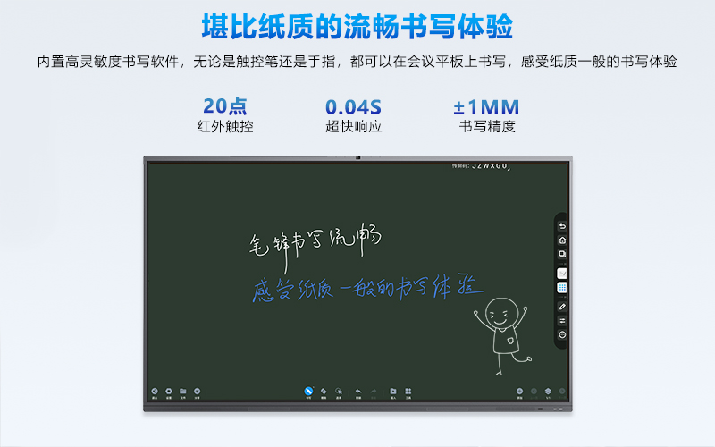 四、書寫批注:投影儀在做演示PPT時,只能電腦來進行修改調整,頻繁的切換操作,會拉低會議的效率;而智能會議平板只需要通過手指或觸摸筆進行智能批注,不僅流暢,而且筆跡還可以移動,放大縮小,同時還具備橡皮擦等功能,韋斯特智能會議平板,采用20點紅外觸控技術,可同時具備多人同時在線書寫功能。