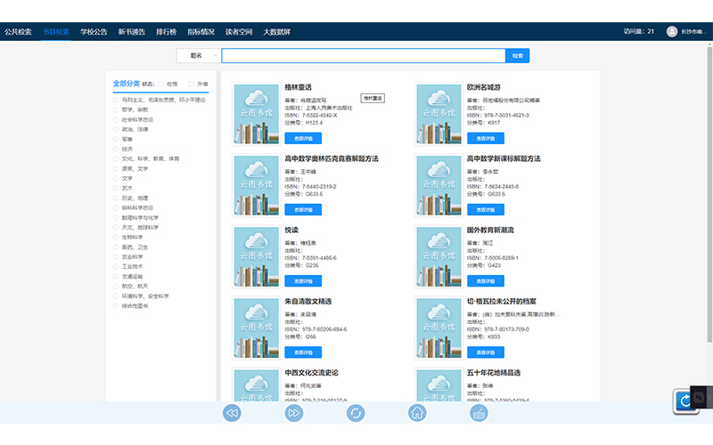 數字化服務平臺是智慧圖書館的重要載體,它將導航檢索機和數字化服務有機結合在一起,為讀者提供全面的數字化服務,包括查詢、借閱、閱讀、推薦等服務。數字化服務平臺可以通過導航檢索機進行訪問,提供全天候、全方位的服務,方便讀者隨時隨地進行閱讀和查詢。智慧圖書館的應用主要體現在讀者服務、知識管理、科研支持等方面。智慧圖書館可以通過數字化服務平臺,提供多種形式的讀者服務,包括在線查詢、在線借閱、在線閱讀、在線咨詢等,使讀者可以隨時隨地享受到高效、便捷的閱讀服務。此外,智慧圖書館還可以通過知識管理系統,對讀者的閱讀習慣、興趣愛好等進行分析和管理,從而提供更加個性化的閱讀推薦和定制化的閱讀服務。