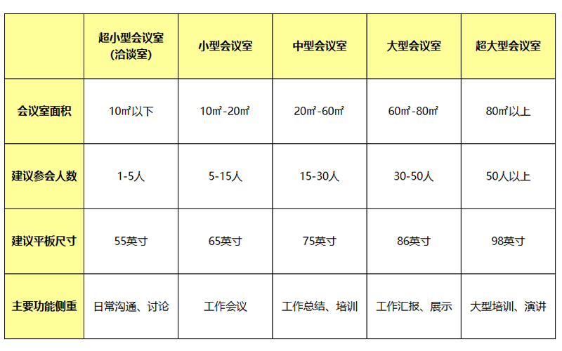 目前市面上會議平板常見的尺寸有55英寸、65英寸、75英寸、86英寸、98英寸。行業內,會議平板尺寸主要是指屏幕的尺寸,不同品牌的會議平板外觀不同,產品整體尺寸不同。通常來說,會議平板邊框越窄,外觀及觀看效果越佳。采購會議平板,一定要結合企業的實際應用場景,以保障觀看效果和使用體驗。如何根據會議室大小,選擇合適的會議平板?韋斯特小編走訪了多家企業經過實地測量,整理了以下建議,望大家采納!